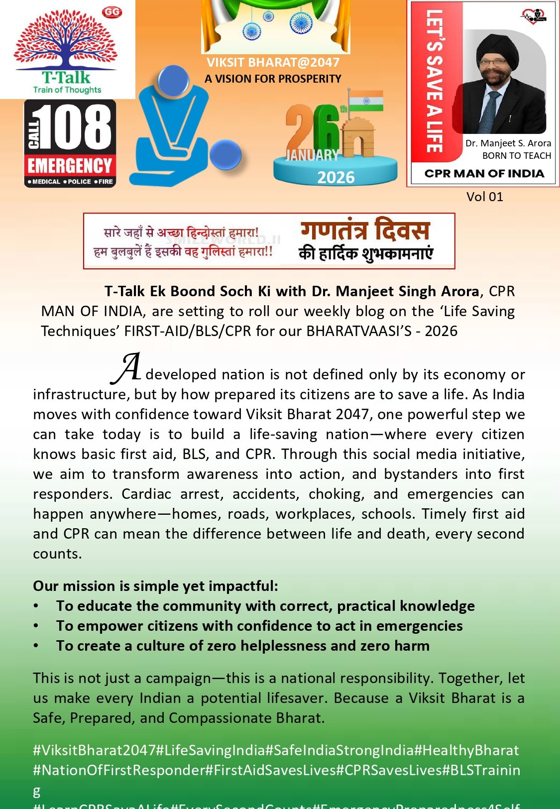 A developed nation is not defined only by its economy or infrastructure, but by how prepared its citizens are to save a life. As India moves with confidence toward Viksit Bharat 2047, one powerful step we can take today is to build a life-saving nation—where every citizen knows basic First Aid, BLS, and CPR.