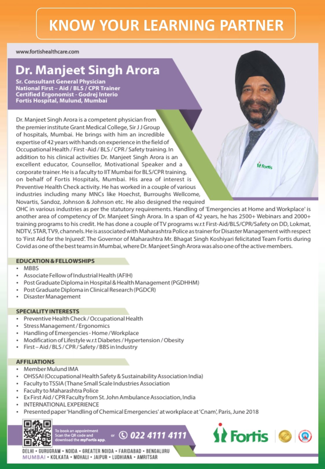Dr. Manjeet Singh Arora is a competent physician from the premier institute Grant Medical College, Sir J. J. Group of Hospitals, Mumbai. He brings with him an incredible expertise of 42 years with hands-on experience in the field of Occupational Health / First Aid / BLS / CPR / Safety Training.