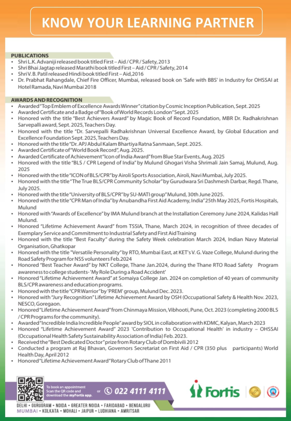 - Honored with the title “CPR Man of India” by Anubandha First Aid Academy, India, 25th May 2025, Fortis Hospitals, Mulund